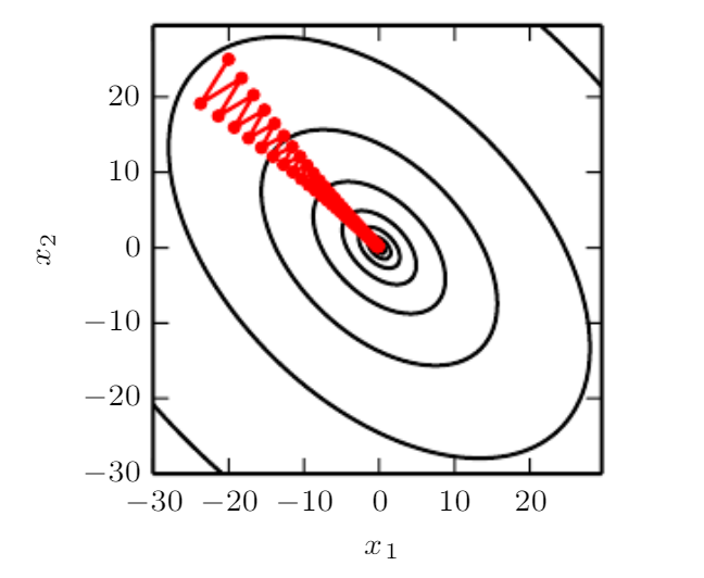 이때 Hessian이 poor condition number를 가진다면, 한 방향으로는 빠르게 변하나, 다른 방향으로는 느리게 변하는데, gradient descent는 이러한 변화를 반영하지 못해 성능이 좋지 않고, learning rate를 정하는 것 또한 어렵다. (한 방향으로 너무 빠르게 움직이기 때문에 learning rate를 줄일 수 밖에 없는데, 다른 곡률이 없는 방향으로는 진전이 거의 없기 때문. 좌측 그림 참고)
