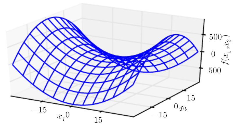 다른 독특한 경우를 보면, 하나 이상의 eigenvalue가 양수이며, 하나 이상의 eigenvalue가 음수인 경우가 있다. 이 경우 한 횡단면으로는 local minimum, 다른 한 횡단면에서는 local maximum이 된다. 위 그림이 이것에 해당되는 경우로 이 경우는 saddle point가 된다.