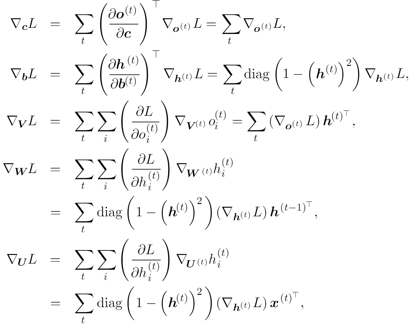 \nabla_{h^{(t)}} L = W^\top(\nabla_{h^{(t+1)}} L) diag(1 - (h^{(t+1)})^2) + V^\top \nabla_{o^{(t)}} L