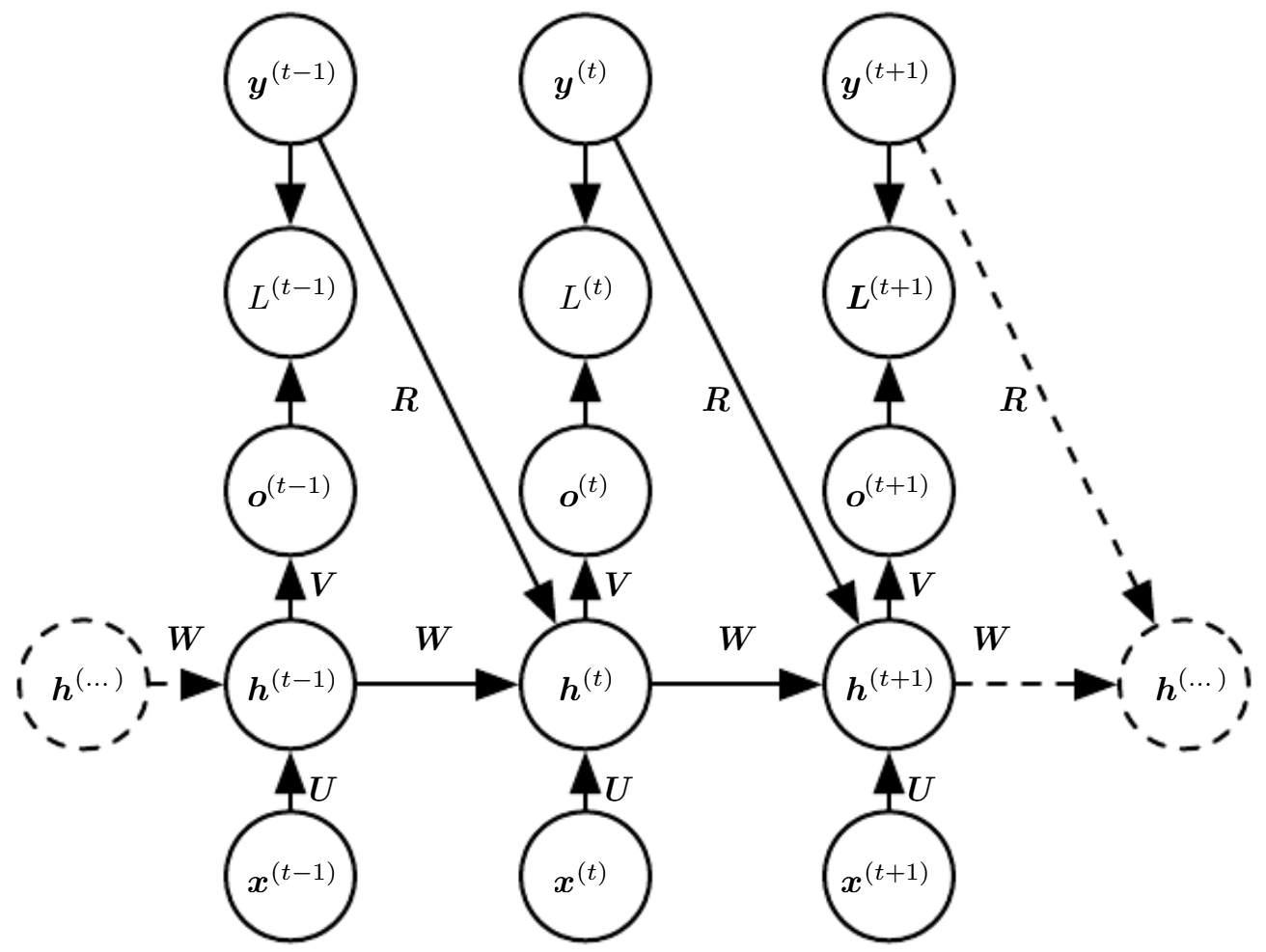 이때 $b, c$는 bias, $U$는 input to hidden 가중치, $V$는 hidden to output 가중치, $W$는 hidden to hidden 가중치를 의미