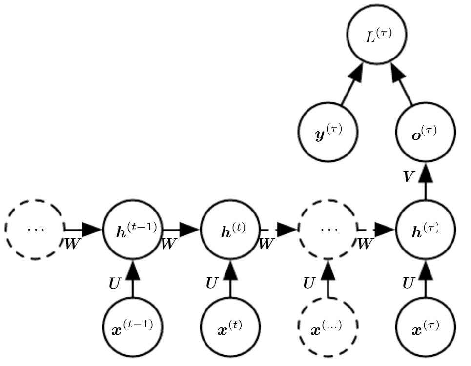 $h$는 hidden unit으로 $t$시점까지의 정보를 lossy하게 요약해 저장하고 있다. 이때 Lossy란 $t$까지의 모든 입력 정보를 전부 저장할 필요 없이 Task에 필요한 충분한 정보만을 저장한다는 의미이다.