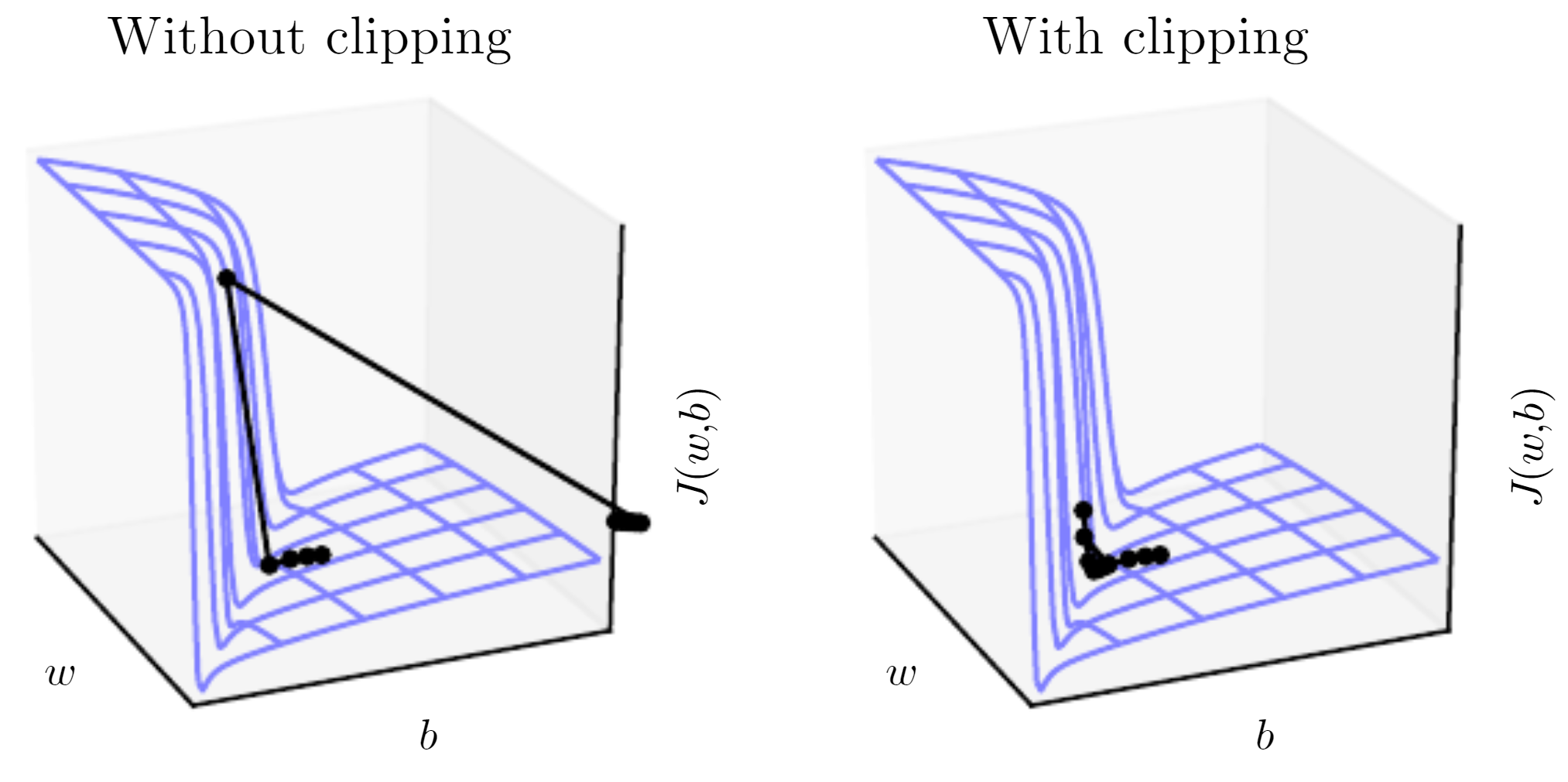 이와 같이 매개변수 기울기가 아주 크면 gradient descent로 갱신하는 과정에서 매개 변수들이 object function이 더 커져 버리는 먼 영역으로 가버릴 수도 있다. 이렇게 되면 지금까지 학습한 노력이 물거품이 되어버린다.