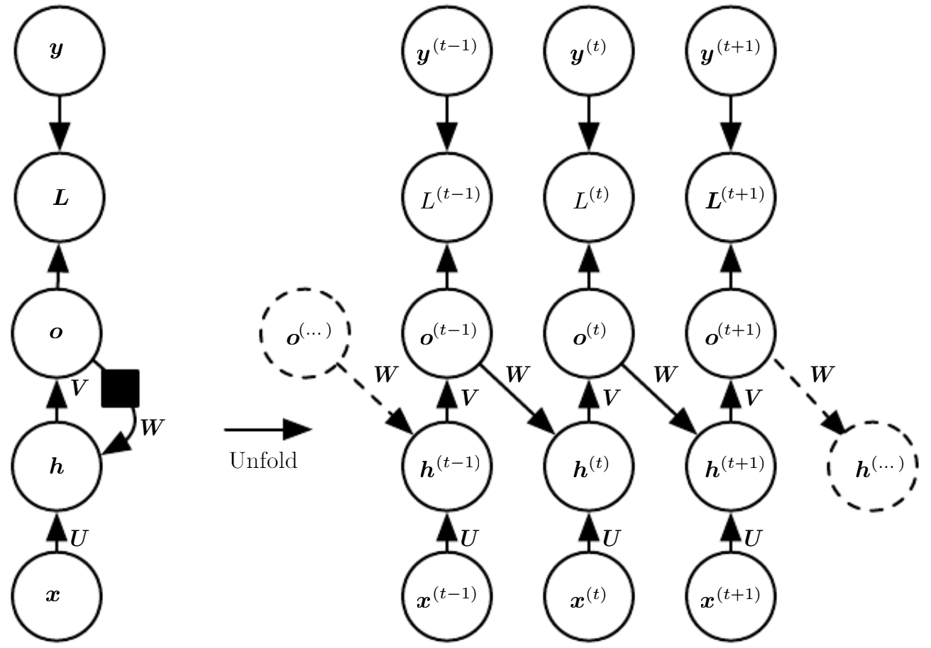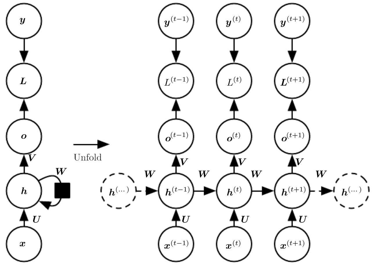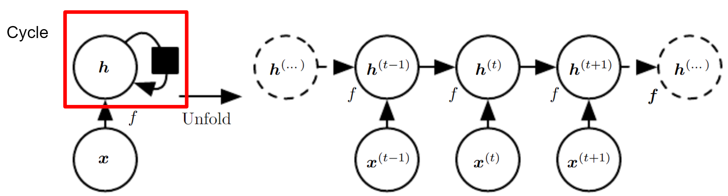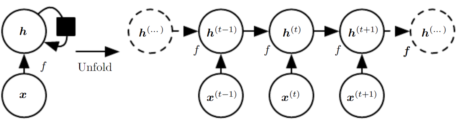이때 Cycle이란 위 그림에서 보이는 것처럼 표현하며, 변수의 현재값이 미래값에 영향을 끼치는 것을 의미한다. 그리고 Unfolding이란 Cycle과 같은 재귀적, 순환적 계산을 펼쳐 반복적인 구조를 가진 계산 그래프의 형태를 얻는것을 말한다.