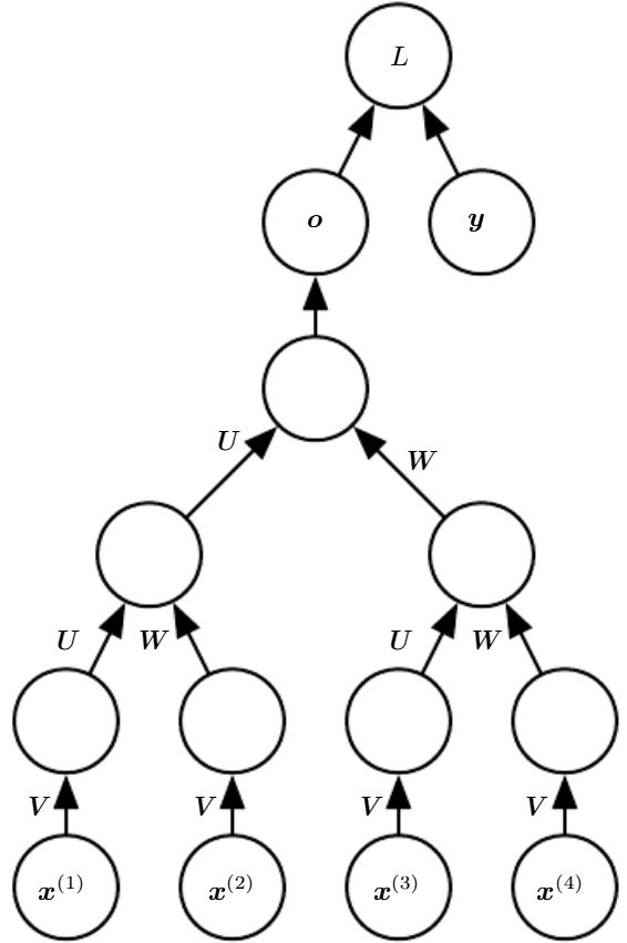 Recursive Neural Network는 자료 구조를 네트워크 구조에 도입한 RNN의 다른 일반화로 Recursive Neural Network의 계산 그래프는 트리 형태이다.