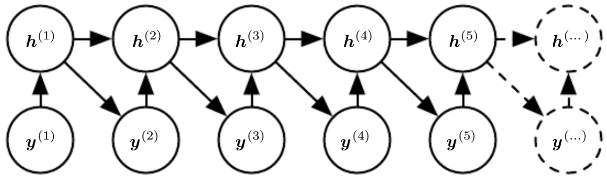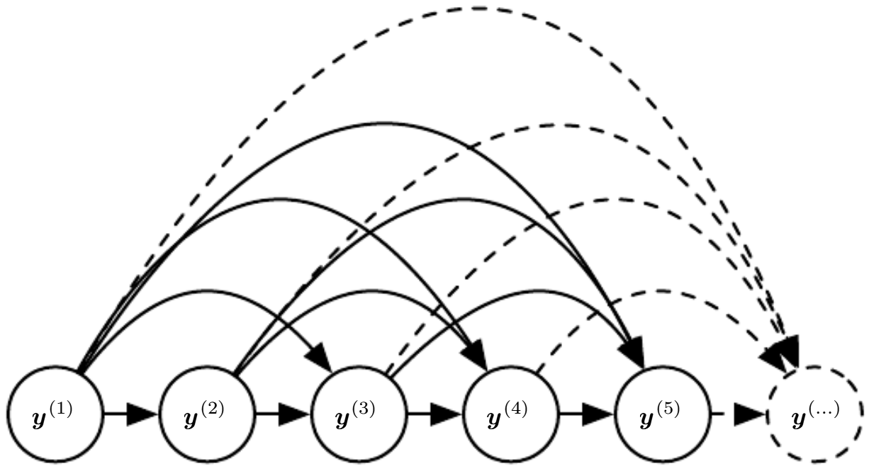 과거 y 값들을 신경망에 다시 입력으로 넣는 경우 directed graphical model의 과거 모든 $y^{(i)}$로부터 현재 $y^{(t)}$로 가는 간선이 존재하게 된다.