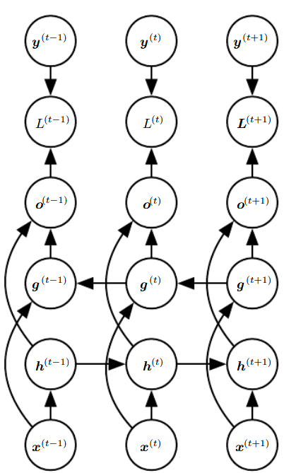 - $o^{(t)}=c+Vh^{(t)}$.