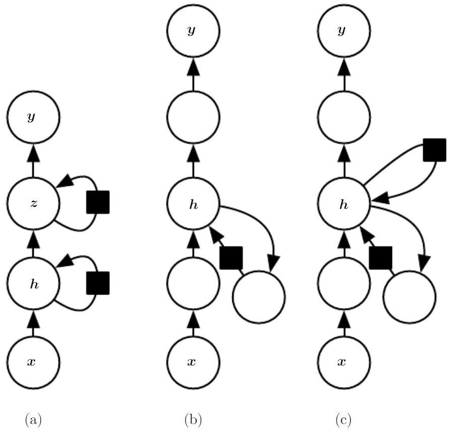 이전에 본 2번 그림의 방식처럼 output을 다음 time step의 hidden unit과 recurrent connection을 만든 경우, 이때 다음 time step에서 사용할 과거 정보들을 직전 output unit이 가지고 있어야 하는데 output unit들은 hidden unit에서 이번 time step의 목표값과 부합되는 정보만 가져가려 하기 때문에 hidden unit에 비해 표현력이 약한것은 당연하다.