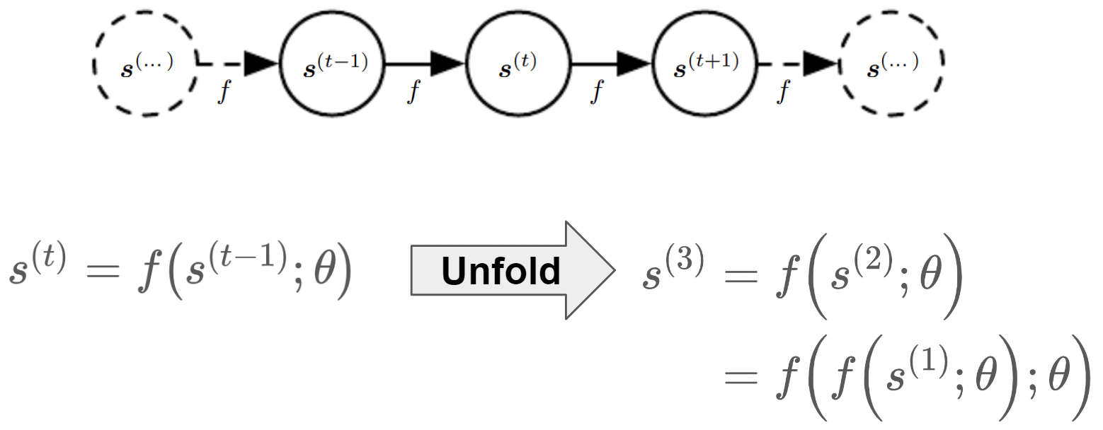 $s^{(t)}$는 $t$가 속한 집합이 $\tau$개로 유한한 경우 $\tau-1$번 적용해 그래프를 오른쪽과 같이 unfold 가능하다. 이때 좌식 $s^{(t)}=f(s^{(t-1)};\theta)$와 같이 이전 상태가 이번 상태를 나타내기 위해 인자로 들어오는 점화식으로 표현되는 것을 확인할 수 있다.