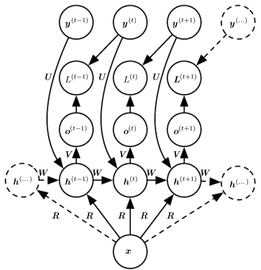 RNN의 가장 학습하기 어려운 부분은 $h^{(t-1)}\rightarrow h^{(t)}$인 hidden to hidden 부분과 $x^{(t)} \rightarrow h^{(t)}$인 input to hidden 부분이다.