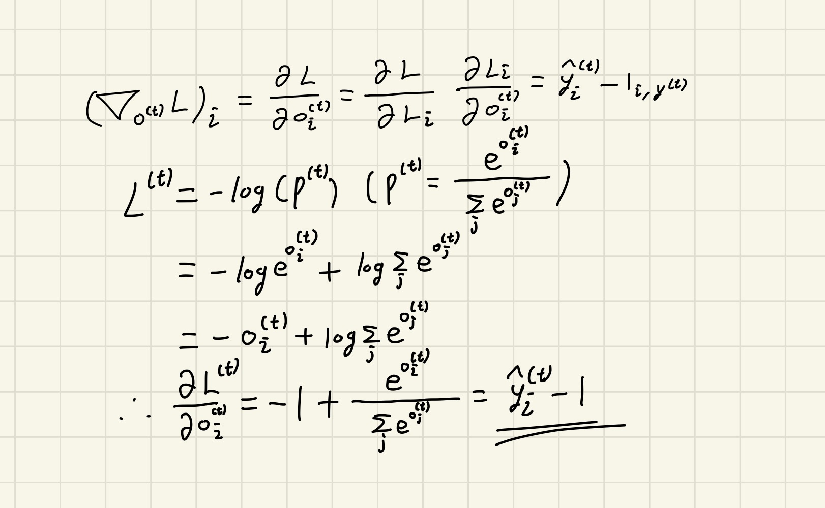 (\nabla_{o^{(t)}} L)_i = \frac{\partial L}{\partial o^{(t)}_i} = \frac{\partial L}{\partial L^{(T)}} \frac{\partial L^{(t)}}{\partial o^{(t)}_i} = \hat y^{(t)}_i - 1_{i,y^{(t)}}