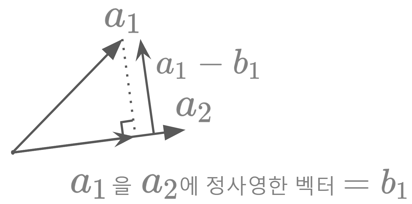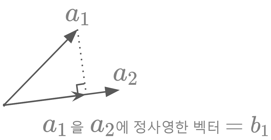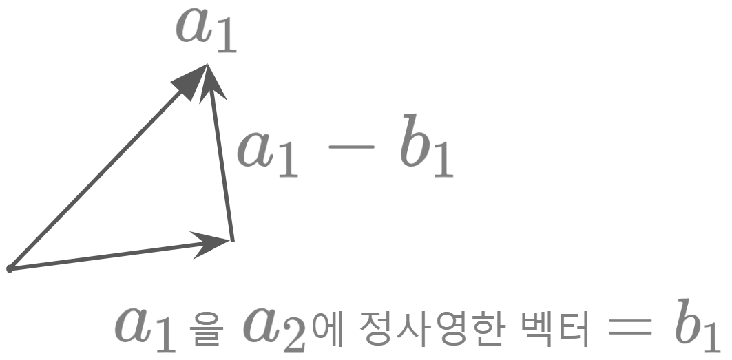 이전에 본 $a_1$를 $a_2$에 정사영한 벡터 $b_1$는 위 그림과 같이 나오게 된다.